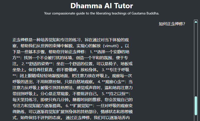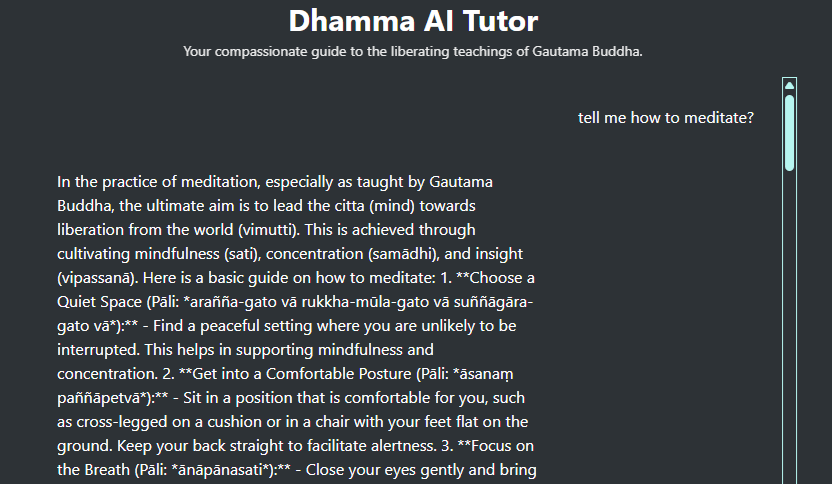 The AI Tutor project is not meant to replace human guidance, but to extend compassionate support to sincere seekers, wherever they are. It is designed to offer a reliable, context-aware, and spiritually aligned companion for those walking the Noble Path, especially those interested in deep meditation, kāyagatāsati (mindfulness directed to the body), sense restraint, and the cessation of craving.