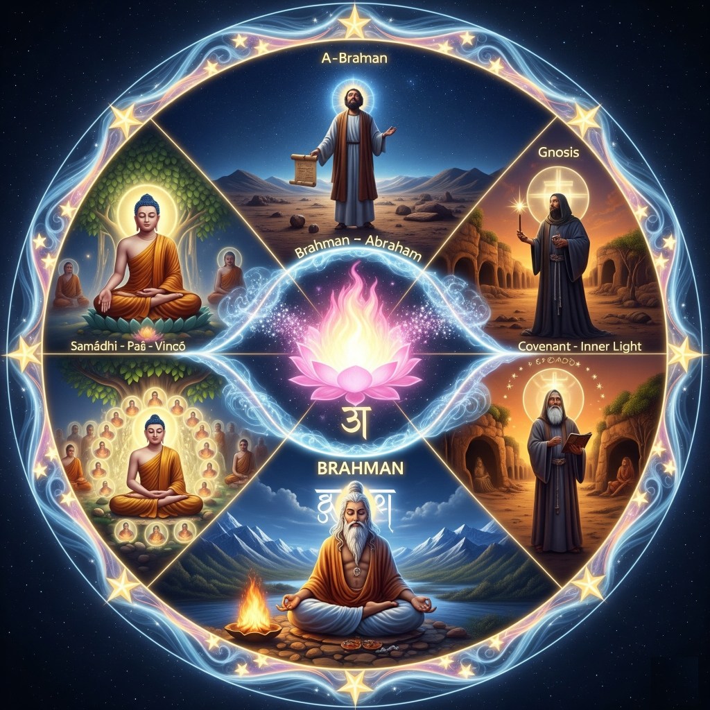 Mandala of One Source, Many Streams: Abraham (A–Brahman) and the Brahmanas as twin reflections of the same lineage, from which Buddhism and Gnostic Christianity arise as siblings.