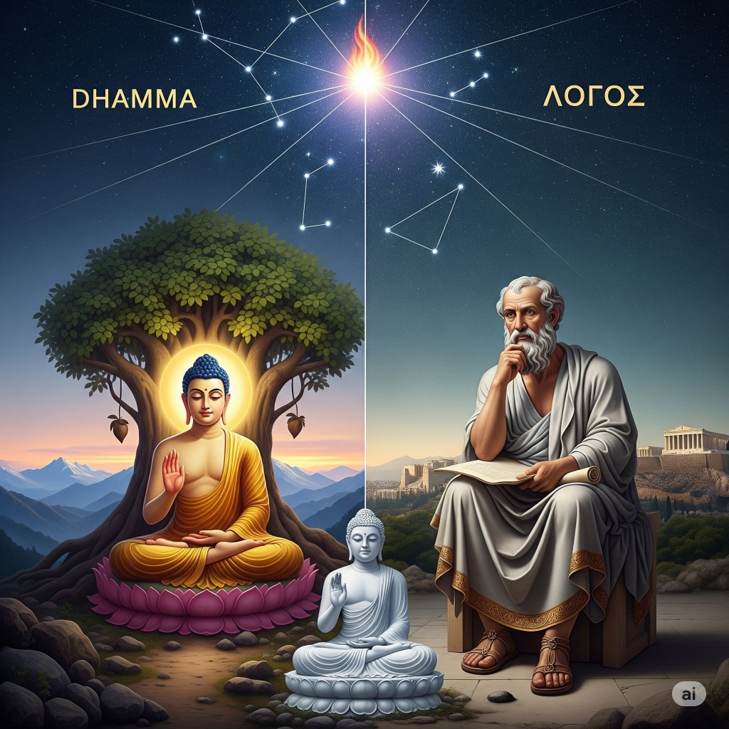 - Cosmic order → Greek logos and Buddhist dhamma function as universal principles of reality.