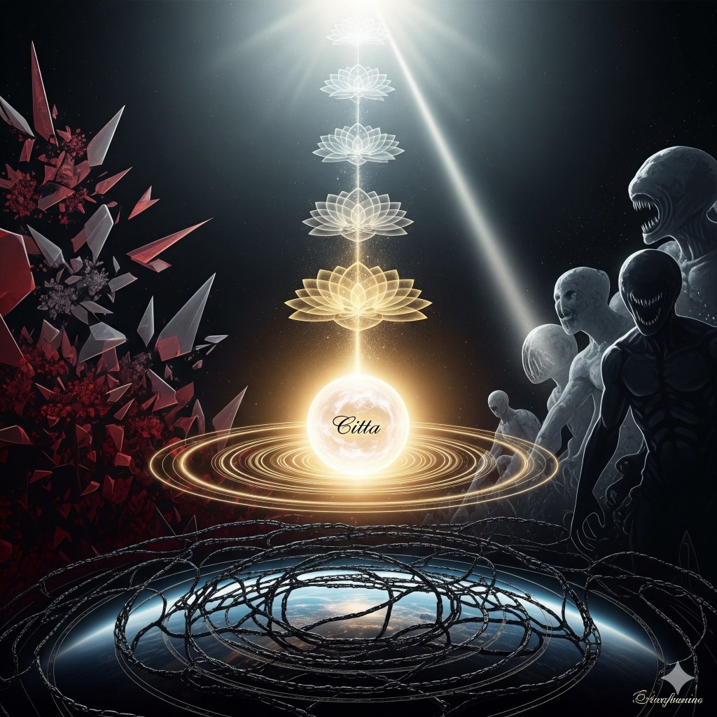 The Cosmic Awakening of Gautama Buddha: a vision of light and shadow, the fall of manussa, the bondage of mankind, and the citta’s radiant ascent into the deathless Nibbāna-dhātu.