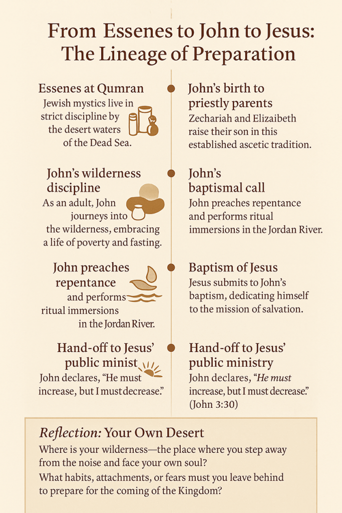 - John as the bridge between Essene–Therapeutae spirituality and Jesus’ mission.