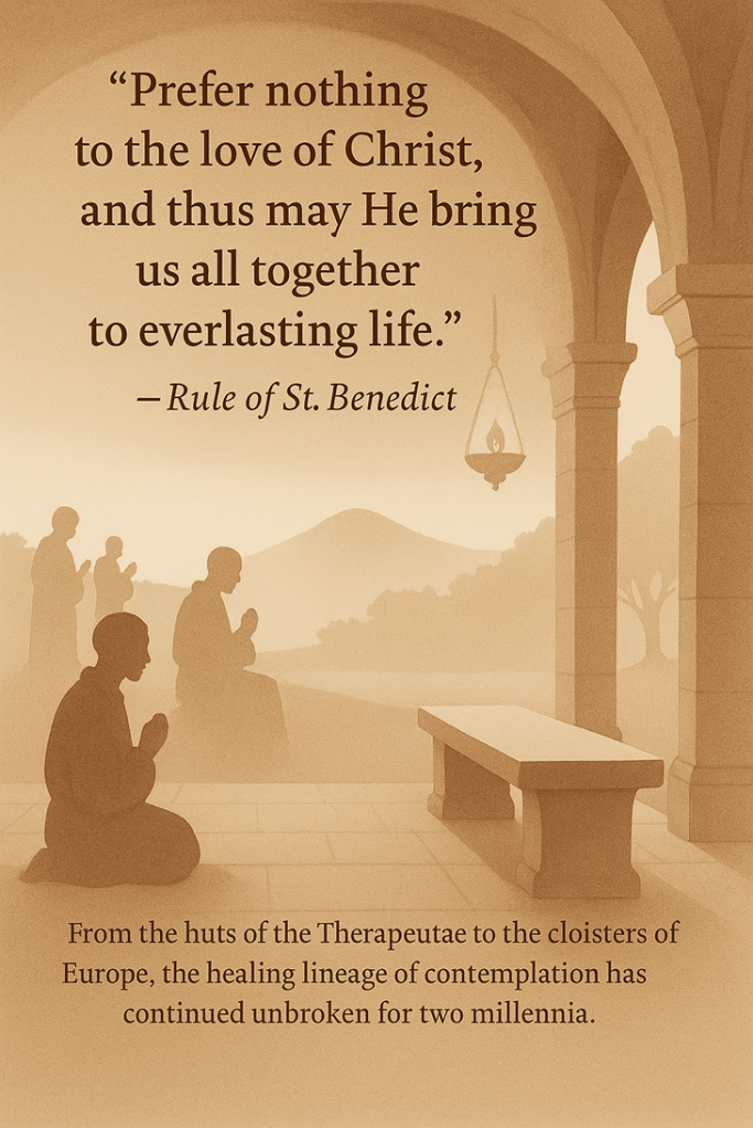 - Modern psychotherapy arises, borrowing the very word “therapy” from the Therapeutae, continuing the work of healing the soul — though often forgetting its transcendent goal.
