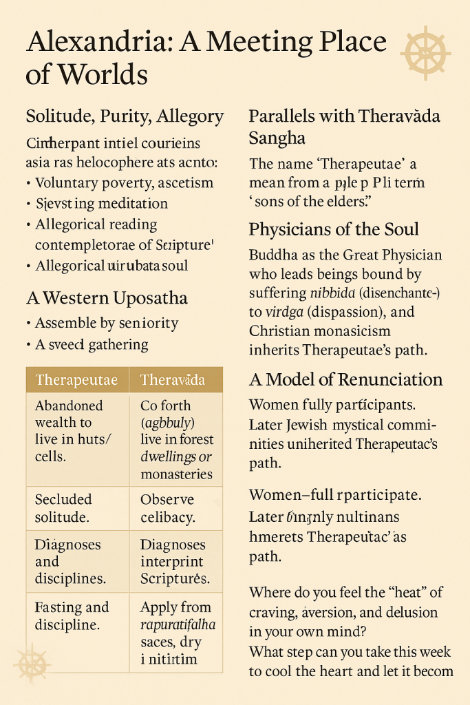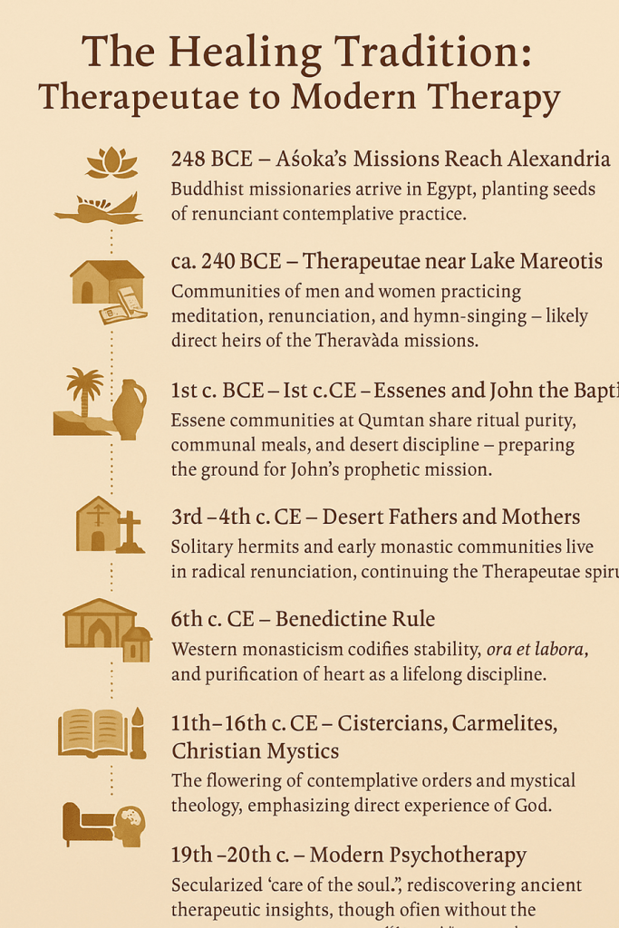 - The Therapeutae of Alexandria, contemplative “physicians of the soul” whose life mirrored the Theravāda Saṅgha.