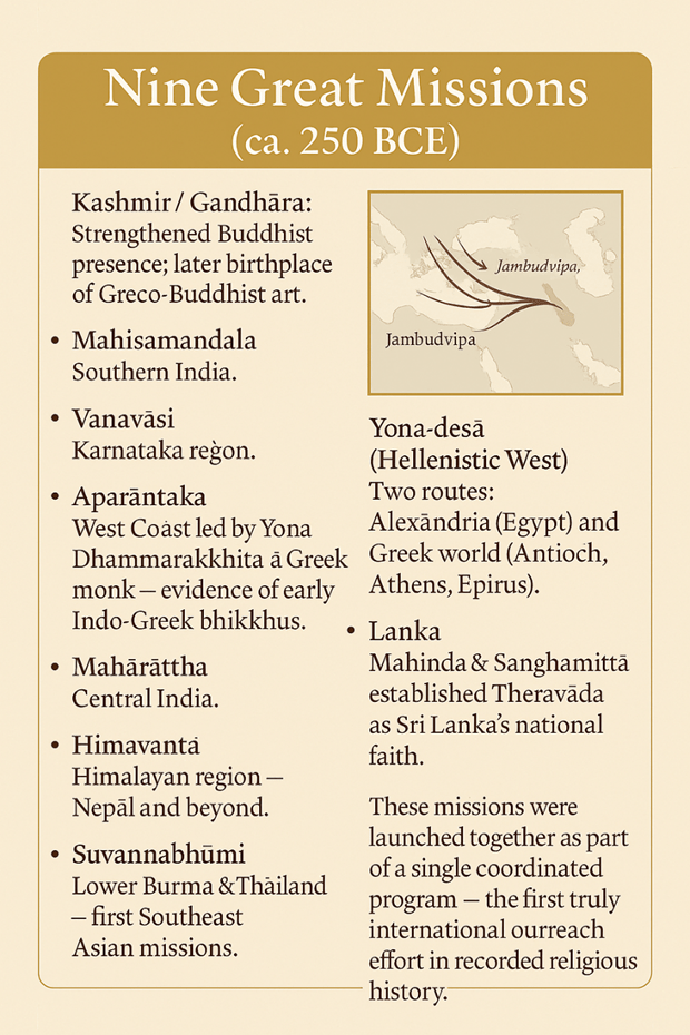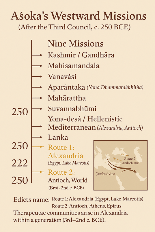 - Aśoka’s missions carry the Dhamma to the Mediterranean, planting seeds in Alexandria.