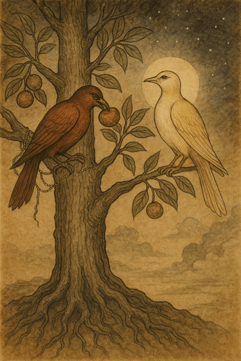 The tree is the body, and beyond that, the entire cosmos. The eating bird represents the restless, survival-bound self, bound by craving, aversion, and ignorance. The watching bird represents the eternal spark — the true self, the manussa essence — luminous, untouched, deathless.